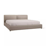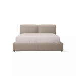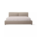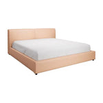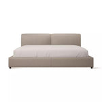 A simple, minimalist bed clad in luxurious leather. A padded headboard offers the perfect backrest when lounging in bed.