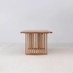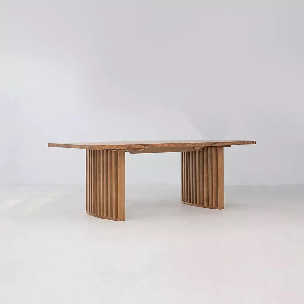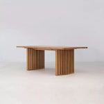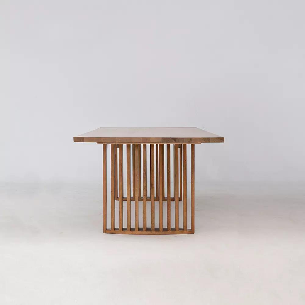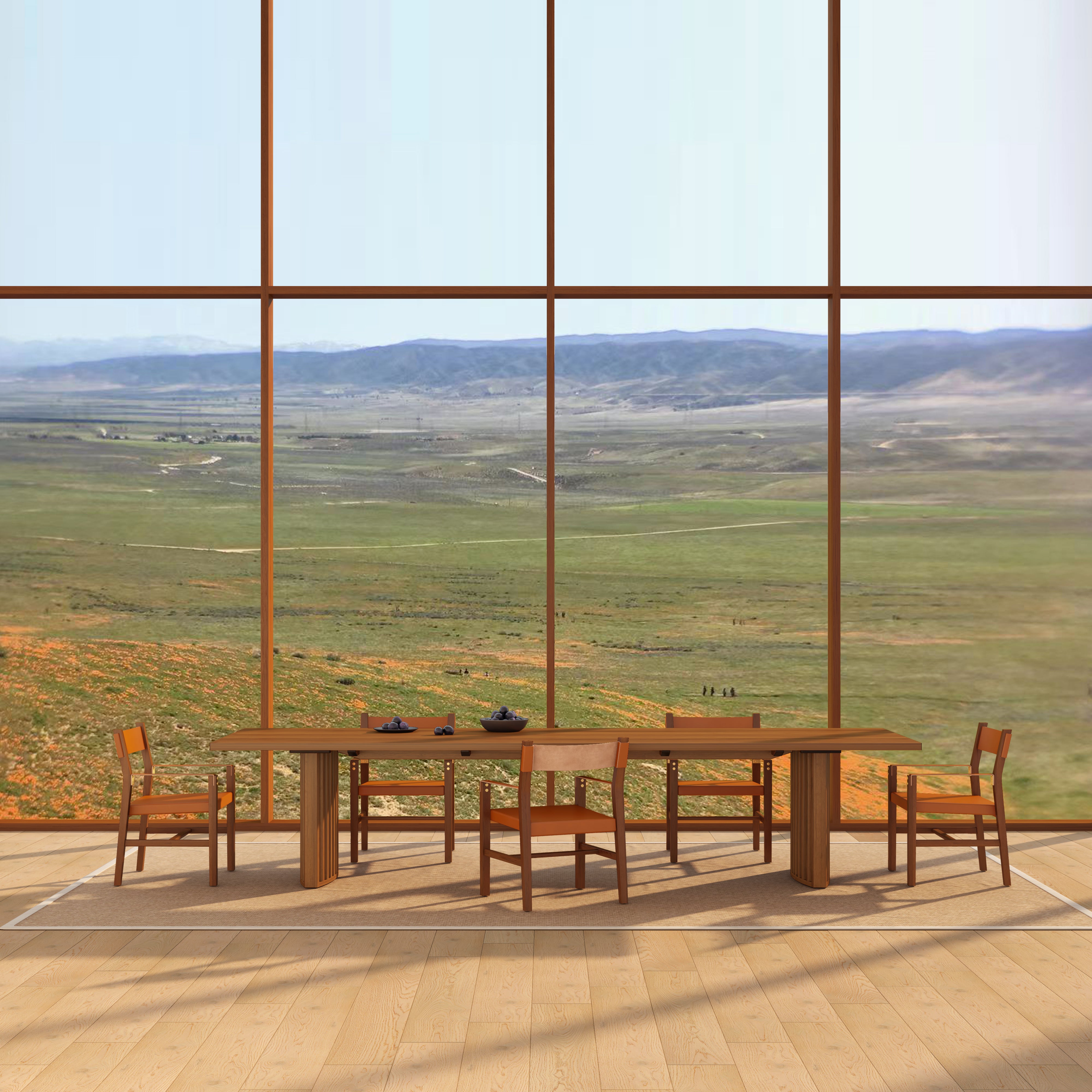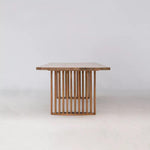 The Zither Dining Table features a vast solid hardwood plank top balanced by the intricate slatted base. Each tabletop is unique, showcasing the natural grain of the wood. Sealed with our proprietary, ecologically friendly finish, the table is easy to clean and stain resistant, making it suitable for both formal and casual settings. Available in 84", 118", and 142" lengths.