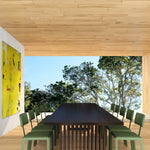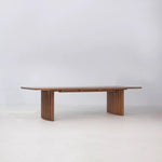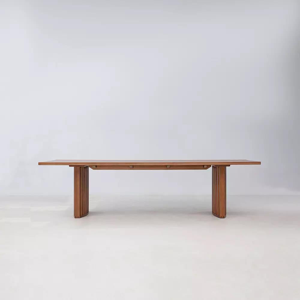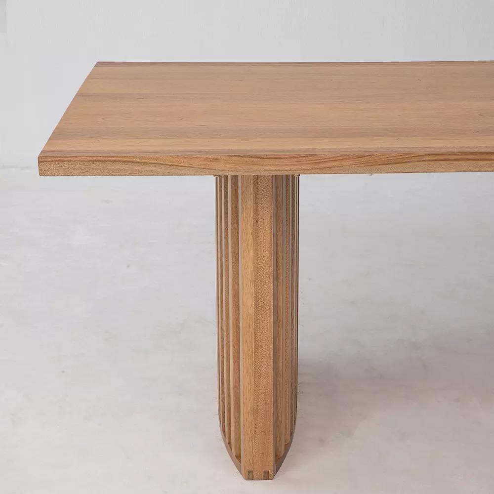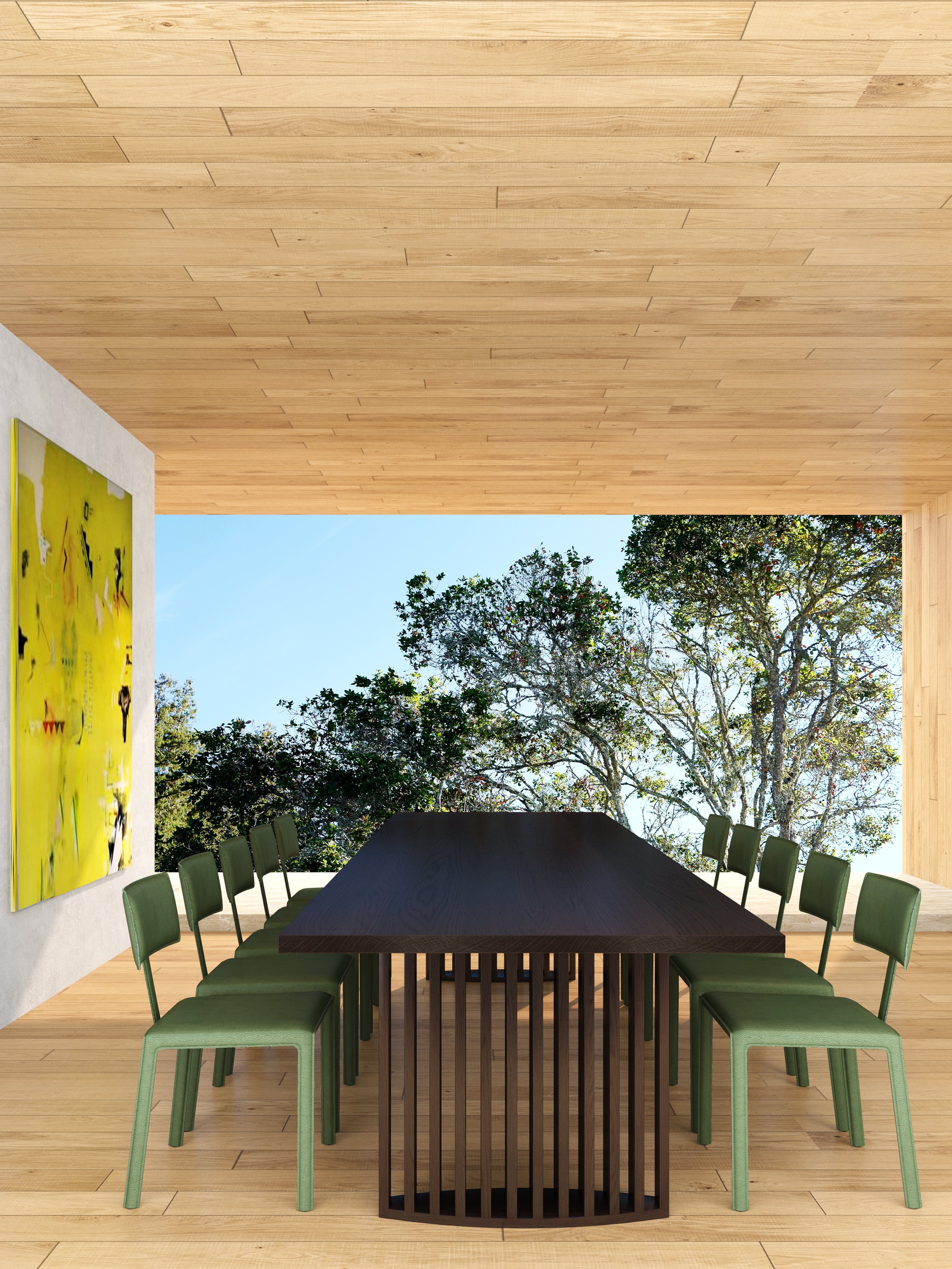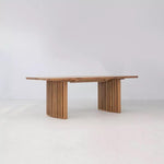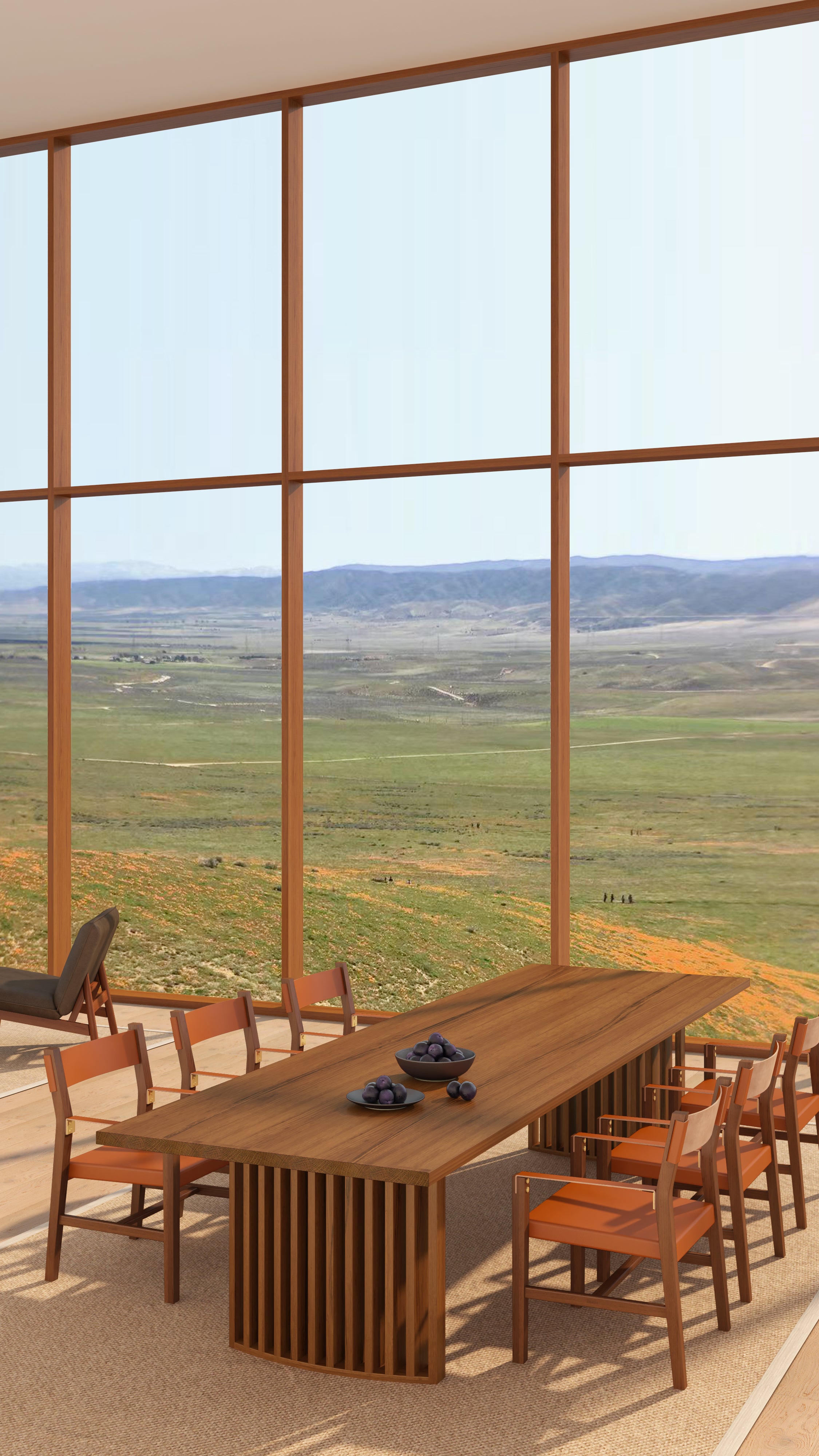 The Zither Dining Table features a vast solid hardwood plank top balanced by the intricate slatted base. Each tabletop is unique, showcasing the natural grain of the wood. Sealed with our proprietary, ecologically friendly finish, the table is easy to clean and stain resistant, making it suitable for both formal and casual settings. Available in 84", 118", and 142" lengths.