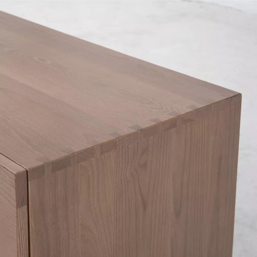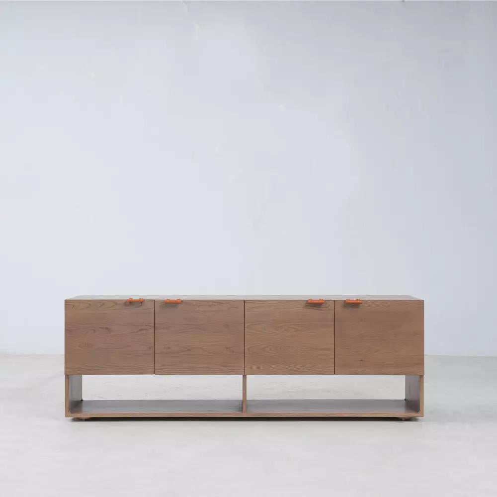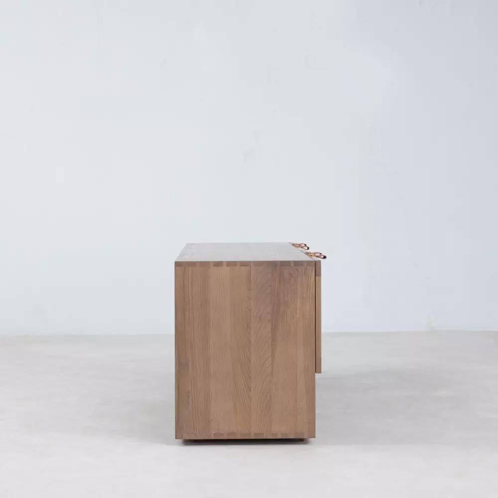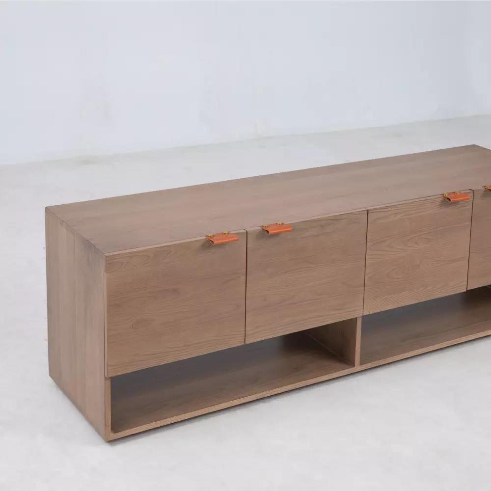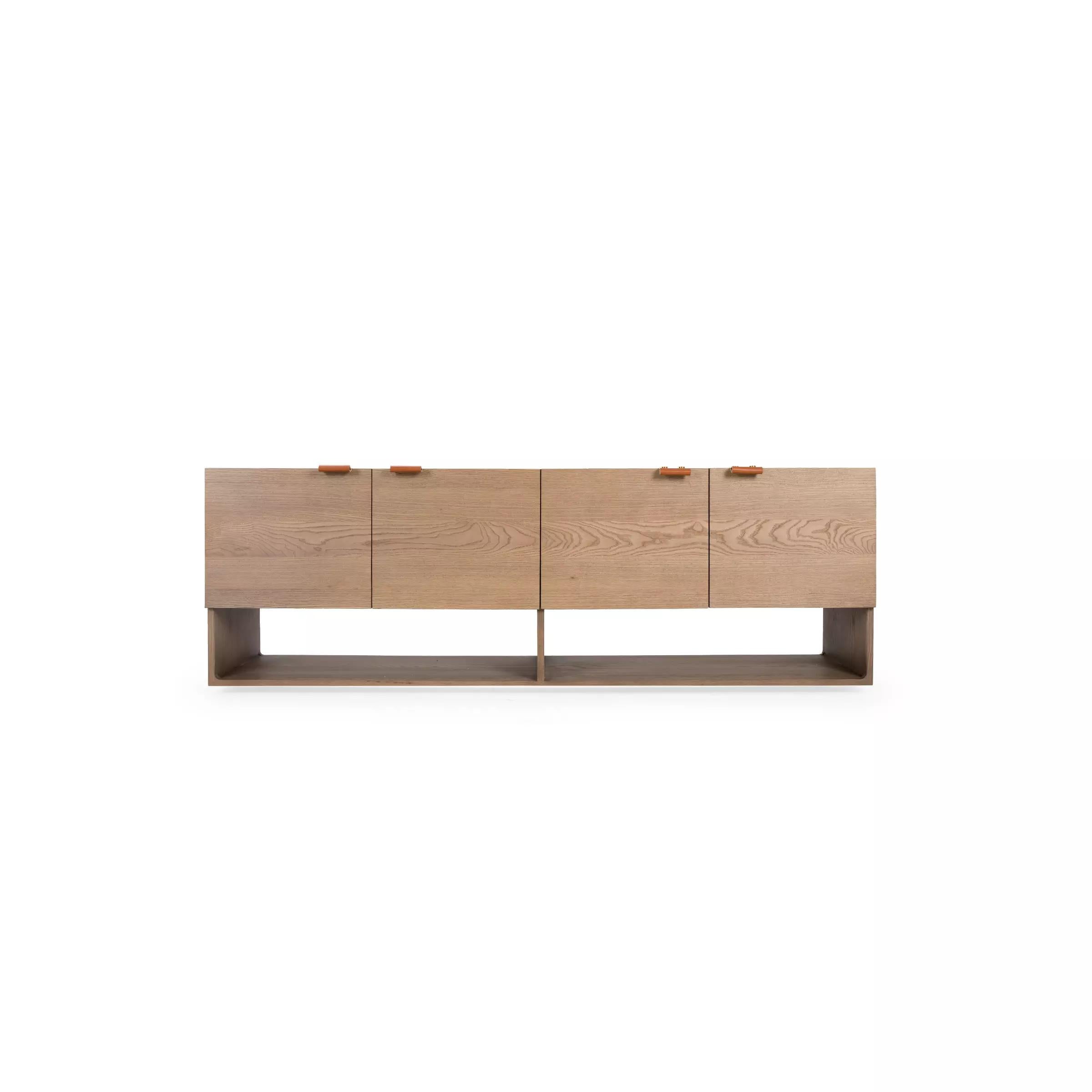 The Cantor media cabinet is a versatile storage unit, rich with the alluring grain of solid American white ash. Handsome vegetable tan leather-pulls for the doors that will patina over time, complete this multi-functional piece.