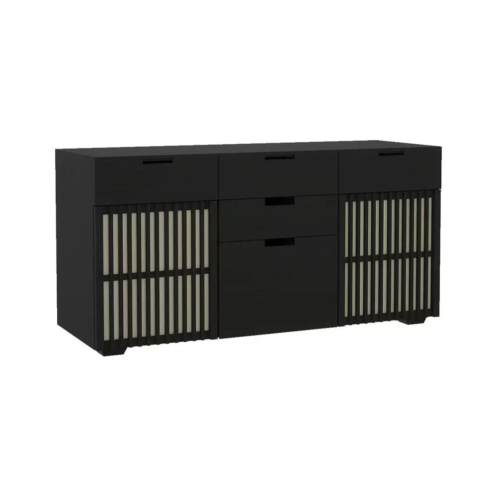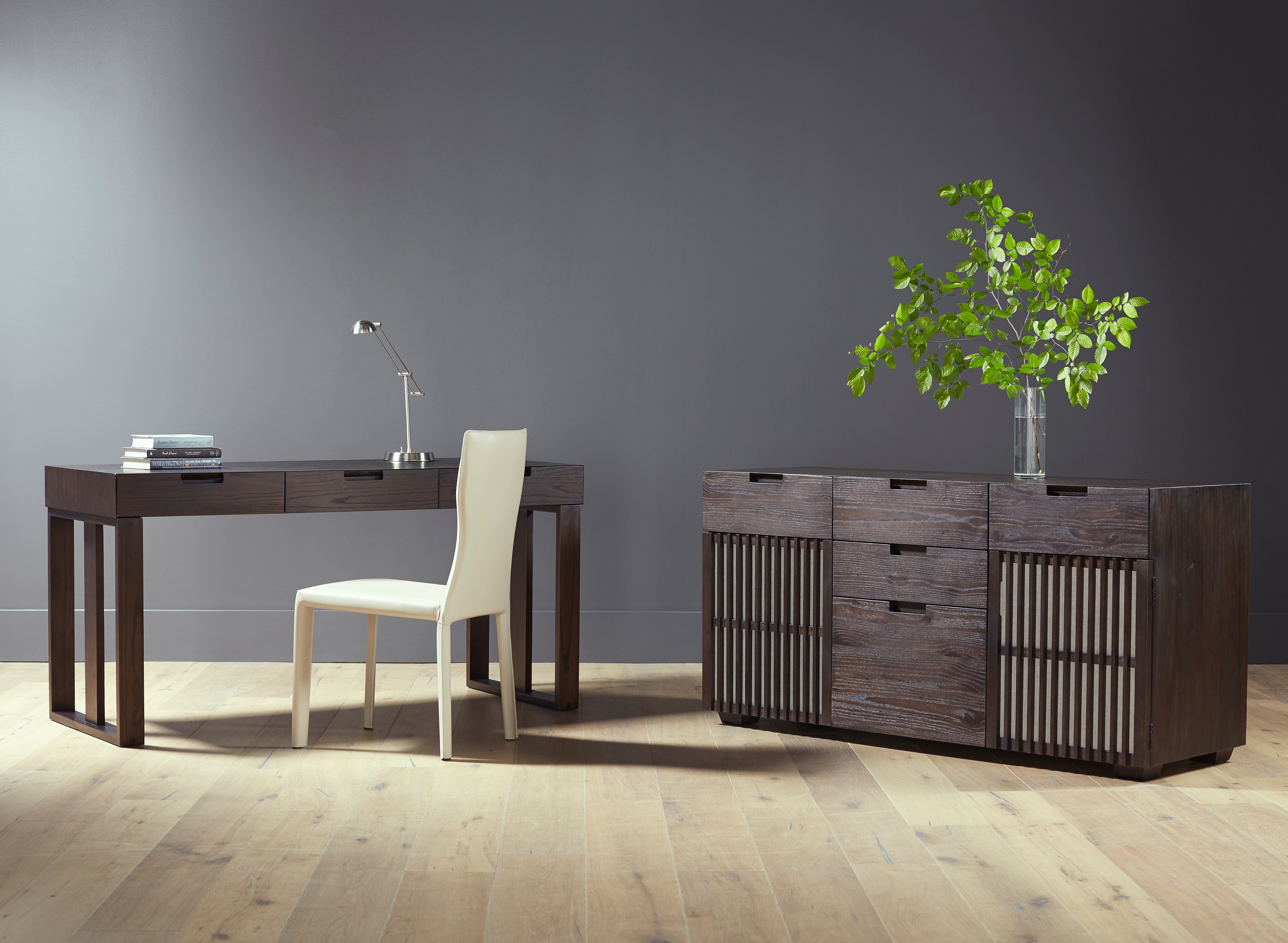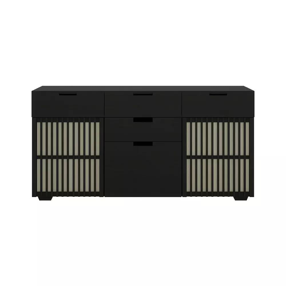 The bold Katsura Collection is inspired by the understated luxury of Asian heritage palace architecture that combines both feelings of modern and traditional design. This spacious credenza offers plentiful storage and beautifully slatted doors. Fabric panels in the doors allow a pop of color and contrast to peek through.