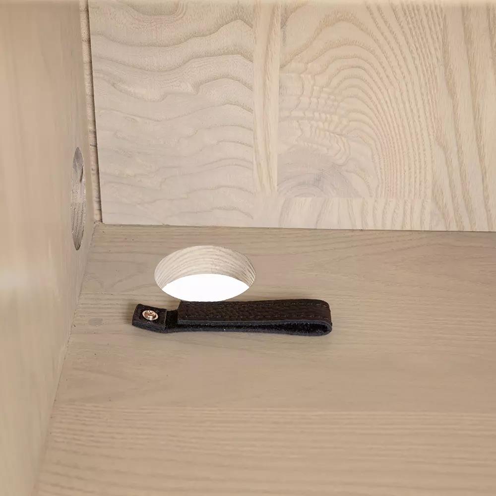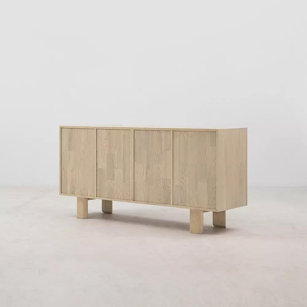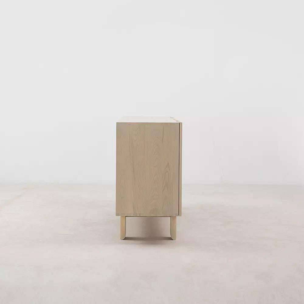The Mesa Sideboard marries beautiful planks of white ash with elegantly tapered legs and gently curved, soft-close doors. A full grain leather inlay between the doors adds a touch of soft texture to contrast with the wood grain patterns, while the legs rest lightly on the ground for a balanced and easygoing silhouette.