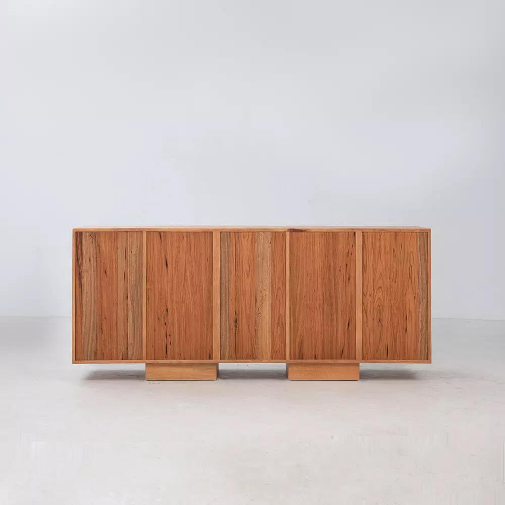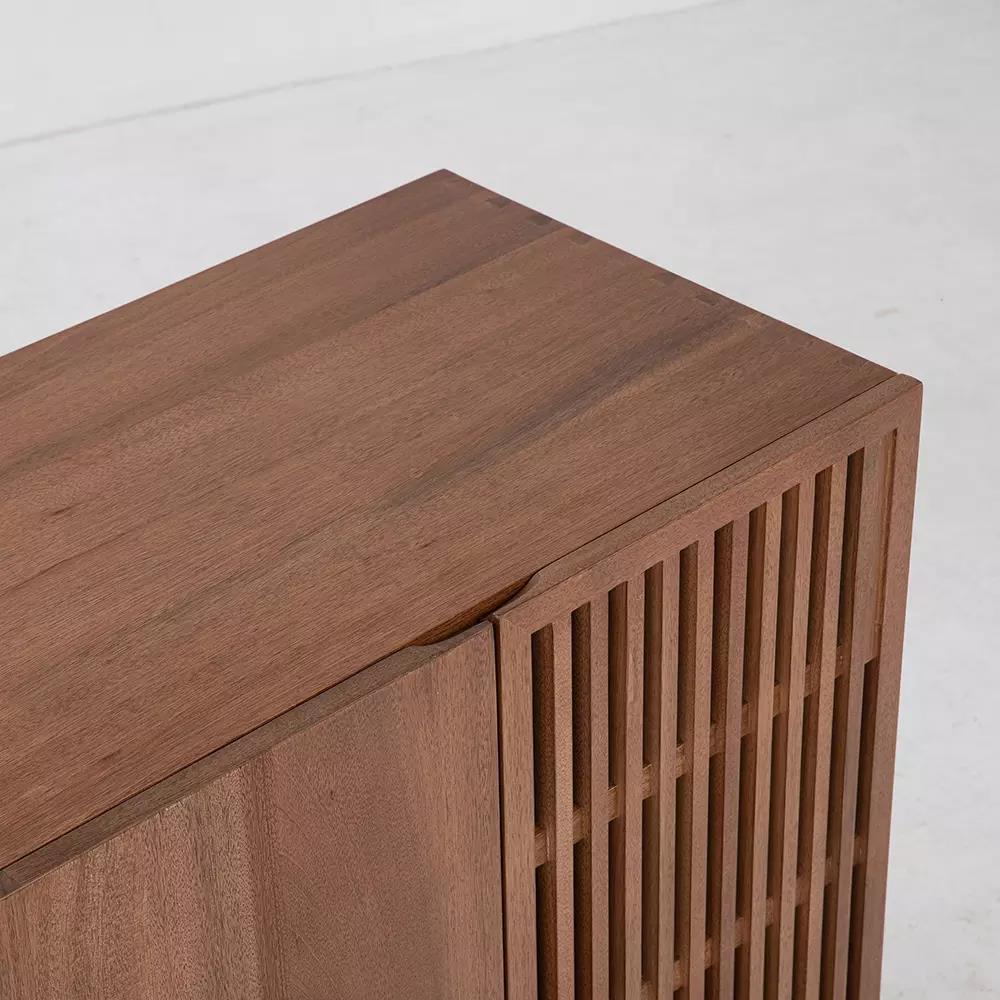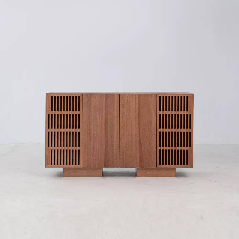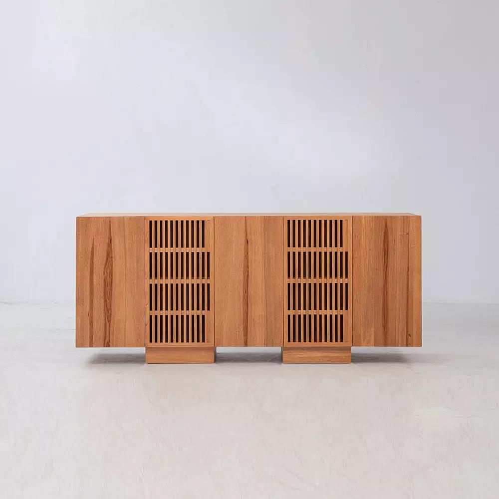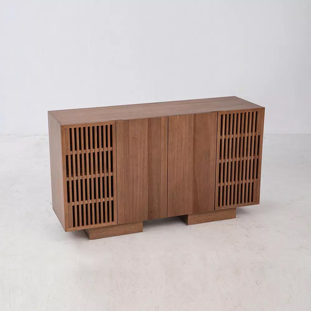 Beautiful slatted doors adorn the Zither Sideboard, opening to reveal spacious storage. The slender latticework is supported by wider feet for a thoroughly modern look. Available in 60", 70", 80", and 96" widths. This sideboard also features clever wire management details, giving the piece additional versatility to be used as a media center.